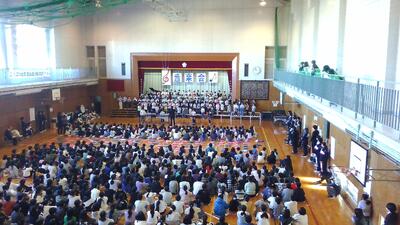 本日、アリーナにて全校児童が集まり、音楽朝会が行われました。