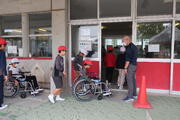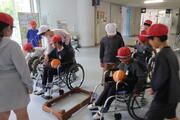 4年生がむちゅうの学習で車いす体験、アイマスクやおもりを体につけた疑似体験などの福祉体験学習を行いました。車いすの介助には、まず相手に声をかけてから動かすことが大切という注意点を知ると同時に実践していました。